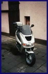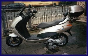 Das ist der Peugeot Elyséo mit 50 ccm. Dieser Scooter gehört zwar zu der "Pimpfklasse", aber das sieht man ihm nicht an! Er wird auch oft als Mercedes unter den Fuffis bezeichnet, und dem kann ich nur zustimmen. Er bietet einen prima Sitzkomfort (auch auf dem Sozius), der selbst bei längerer Fahrt anhält. Sowohl unter der Sitzbank, als auch im Topcase findet je ein Integralhelm Platz. Und was die Optik angeht, haben ihn schon Einige als "Großen" angesehen. Trotz seiner Größe hat er den kleinsten Wendekreis seiner Klasse.